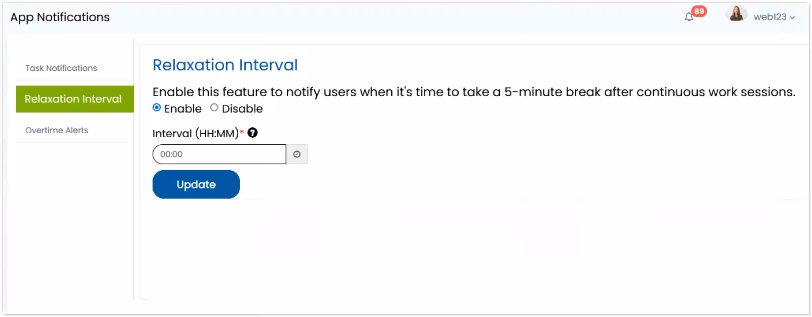 4. Specifying Notification Interval : If opting for repeated alerts, specify the time interval for notifications to ensure users are informed when they exceed their minimum working hours.