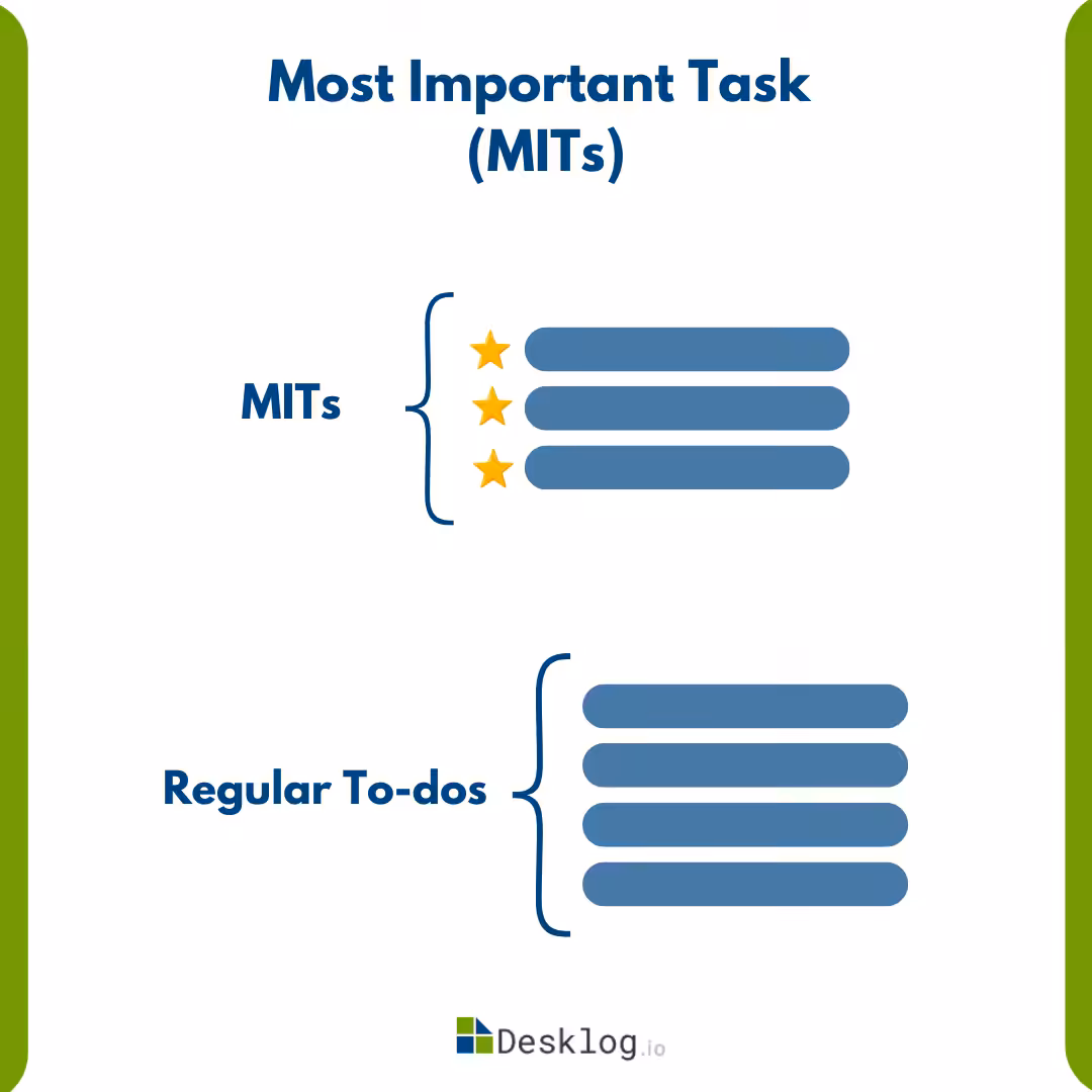 While you may accomplish more tasks throughout the day beyond your MITs, setting aside time each morning to identify your Most Important Tasks (MITs) and set deadlines ensures you consistently focus on the most important ones. One of the advantages of the MIT task prioritzation method is its simplicity – you don’t necessarily need a comprehensive to-do list to utilize it effectively.