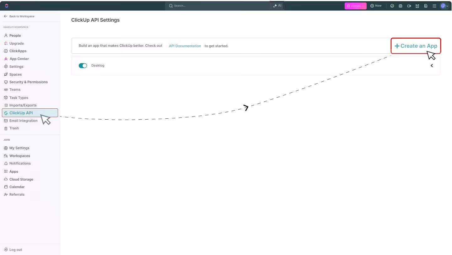 Click on “ClickUp API” and select “Create an App”.