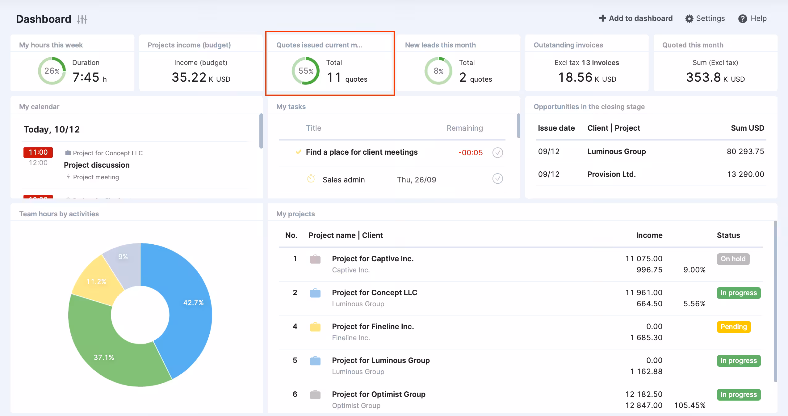 With Scoro, you can efficiently plan and forecast resource allocation, ensuring optimal team utilization. Real-time financial insights, including project and client profitability tracking, empower you to make data-driven decisions and maximize revenue. Scoro offers powerful quoting and budgeting tools, as well as in-depth project, client, and service-level profitability tracking.