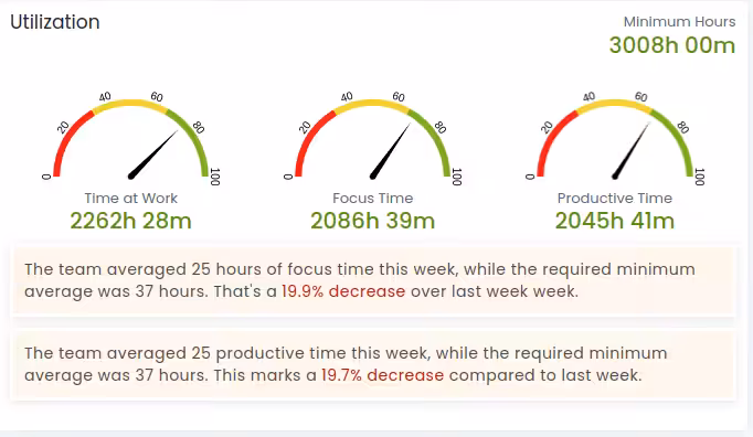 - Time utilization (Time at Work, Focus Time, Productive Time)