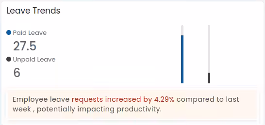 Tracks the number of Paid and Unpaid leaves taken by employees over a selected time period, supporting attendance and workforce planning.