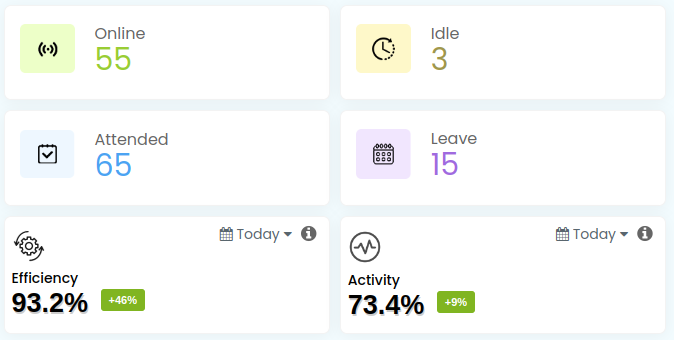 Below this, the Efficiency Rate and Activity Rate provide a snapshot of overall team engagement. These insights allow managers to support employees effectively while fostering autonomy and transparency.