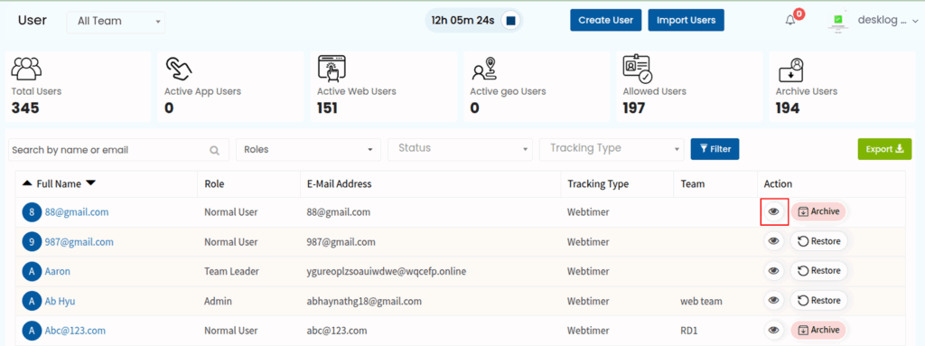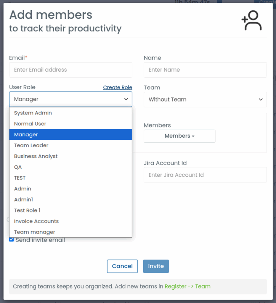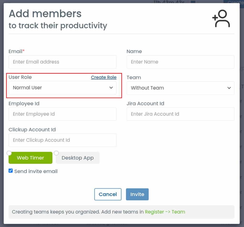 When adding members to Desklog, you can assign specific roles to each member. While entering their information, you’ll find the “User Role” option, where you can assign the appropriate role for each individual.