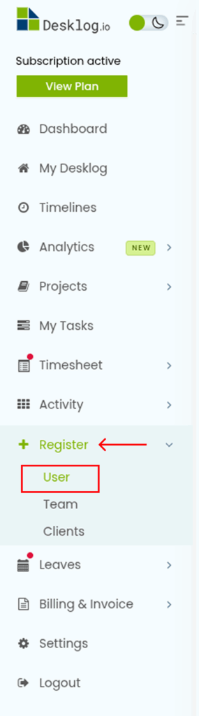 To edit a user role in Desklog, go to Register in the left panel menu and select Users from it.