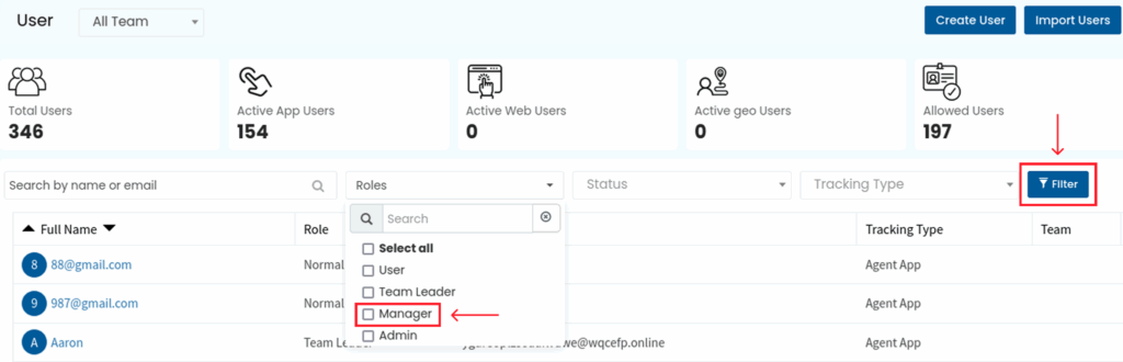 - Click on the Roles drop down and select Manager. After selecting Manager click on the Filter button.