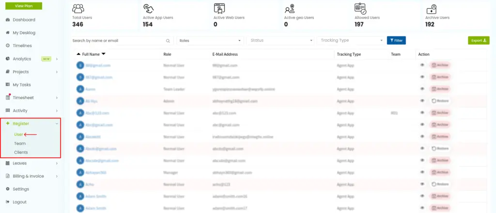 - From the Admin left panel, click Register and select User.