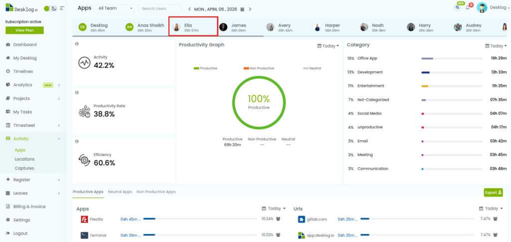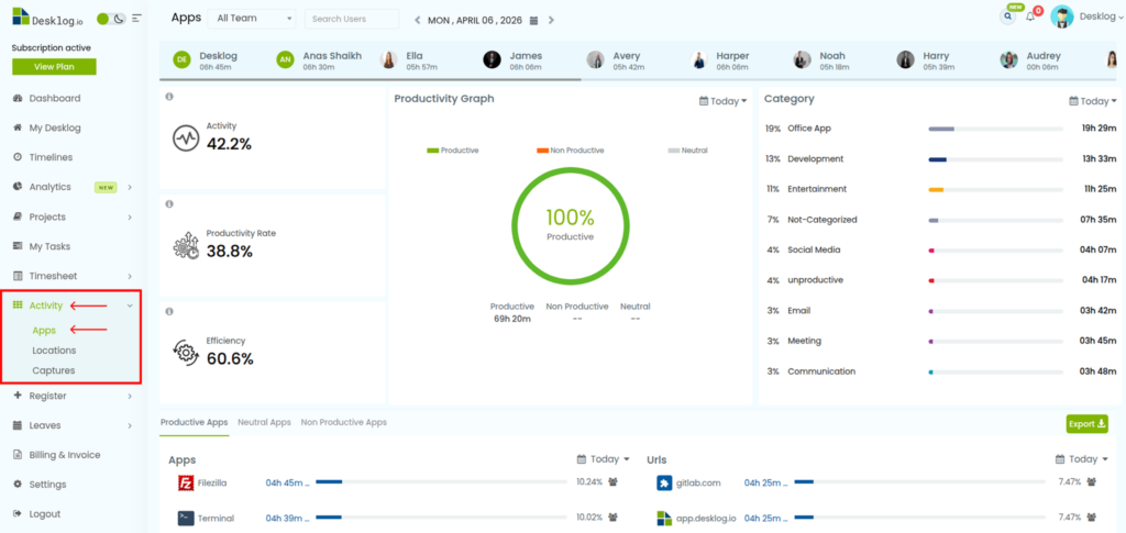 - Go to the Activity section from the left panel. Select Apps from the dropdown.