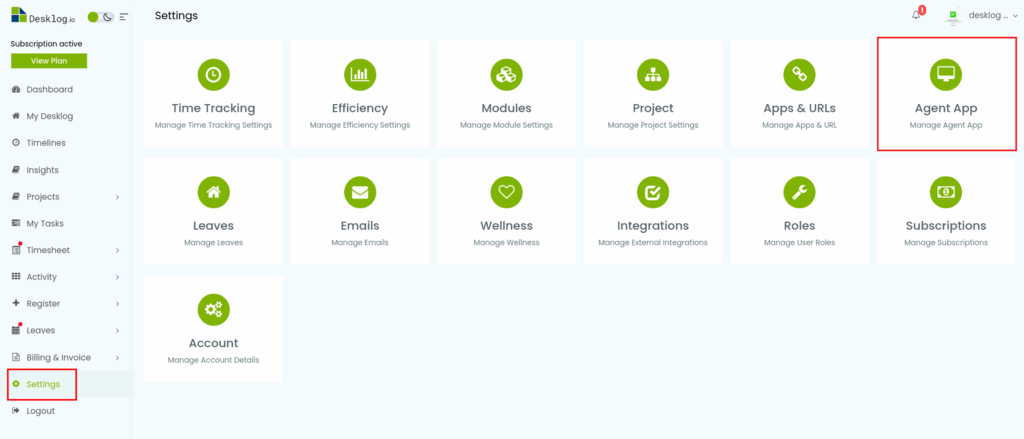 Step 1: From the admin left panel, click on Settings and from the interface that opens, select Agent App.
