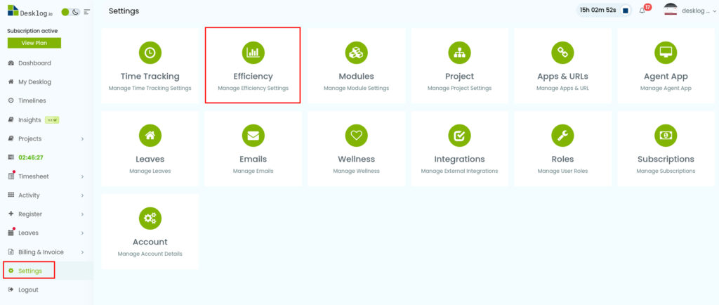 - Click Settings from the side menu and select Efficiency from the settings menu.