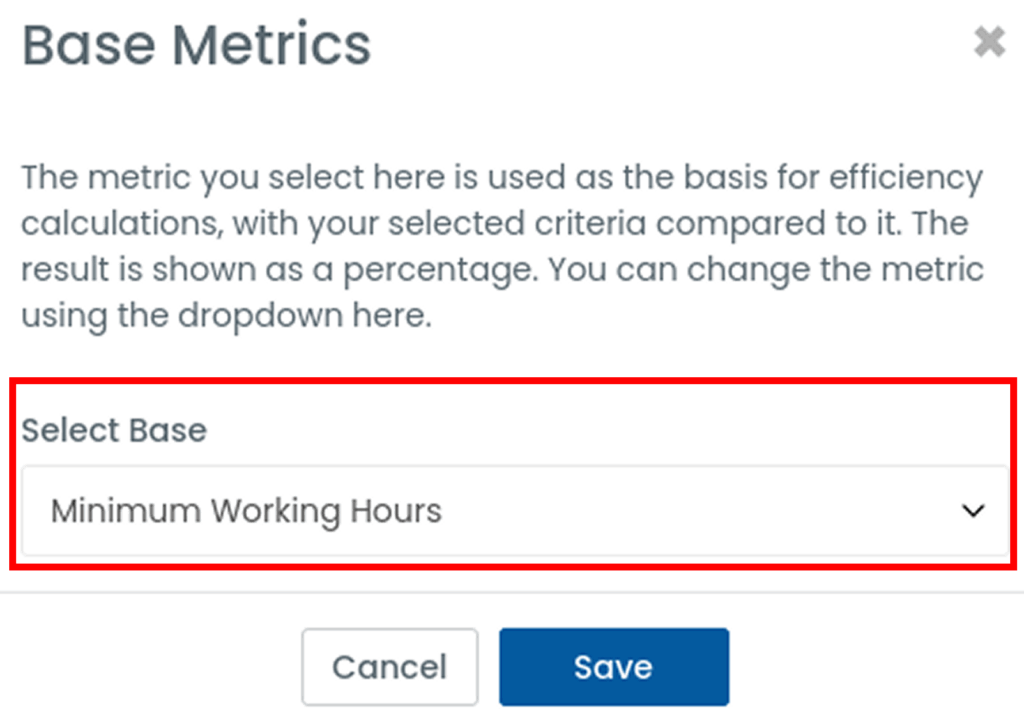 The Base Metric serves as the denominator in your efficiency calculations. To select:
