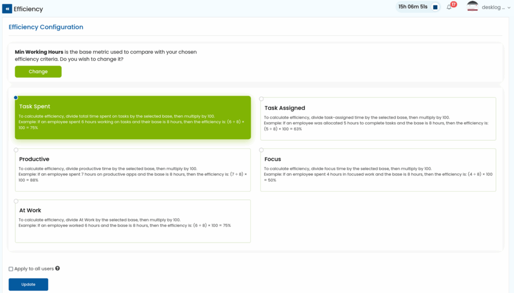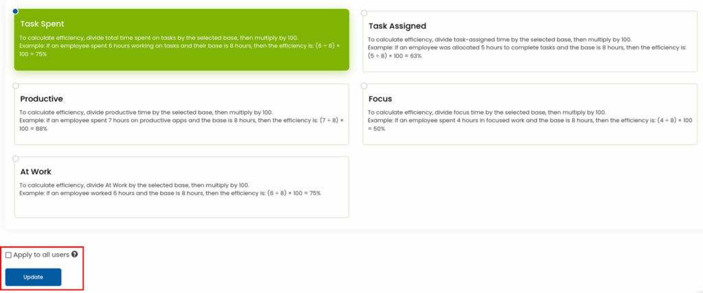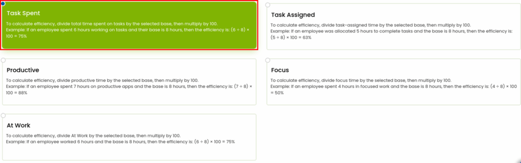 The result will display as a percentage indicating how efficiently an employee is utilizing their work hours.