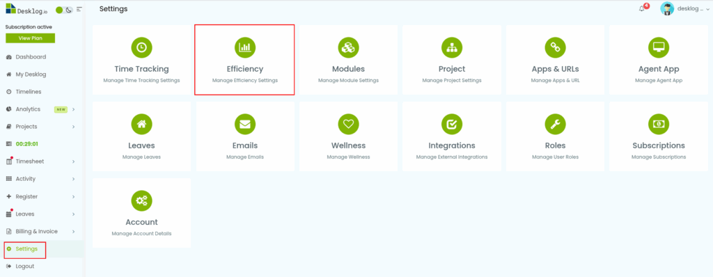 - Click Settings from the side menu and select Efficiency from the settings menu.