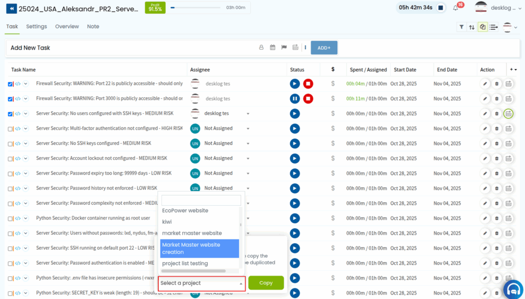 From the displayed list, select the tasks you want to copy. Next, choose the target project from the drop-down list.