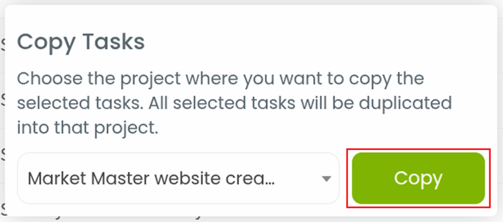 Finally, click the Copy button. The selected tasks will be successfully duplicated in the chosen project while remaining in the original one.