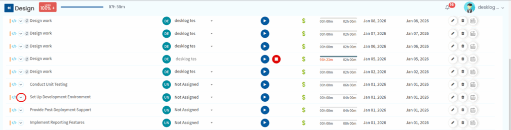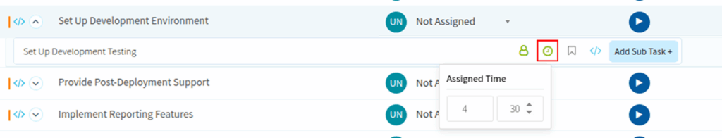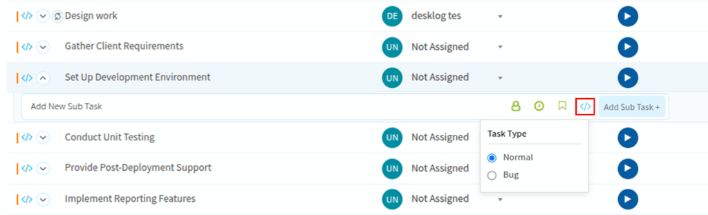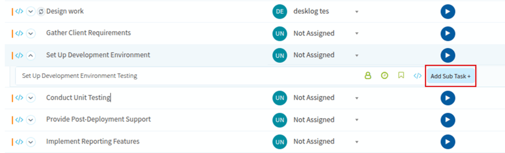 Once you select a project, you will see multiple tasks associated with it. Select the parent task to which you want to add a sub-task, and click the arrow icon next to it.