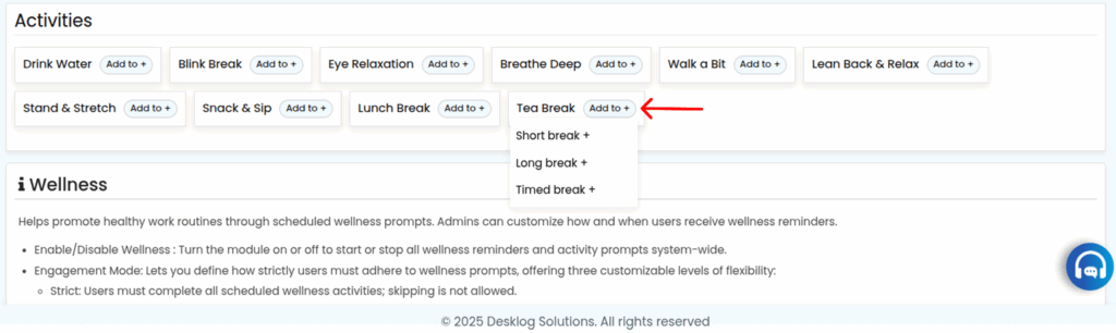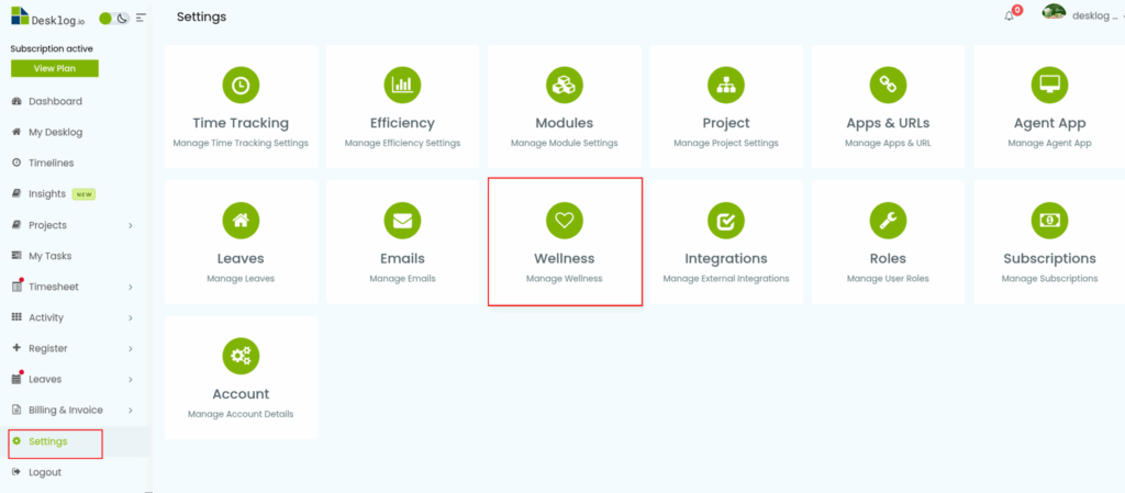 To enable Timed Breaks, go to Settings on the Admin Menu Bar and select Wellness under the settings section.