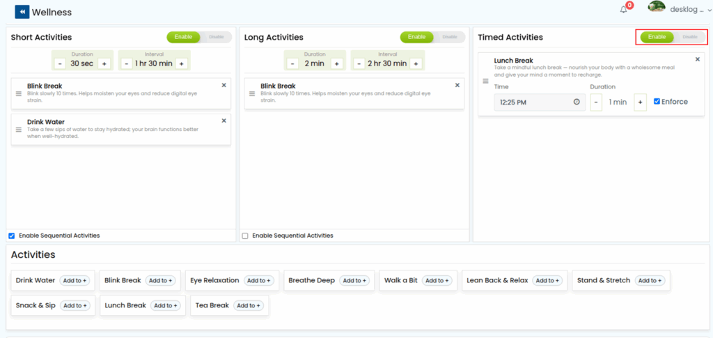 You can customize your timed breaks by adding options from the Activities section. Click on Add to, then select the desired categories from the list.