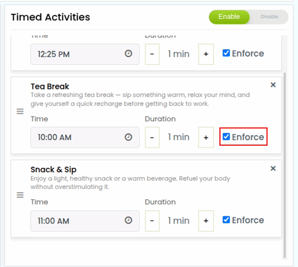 In the Timed Activities section, you’ll find an Enable/Disable toggle button on the side.