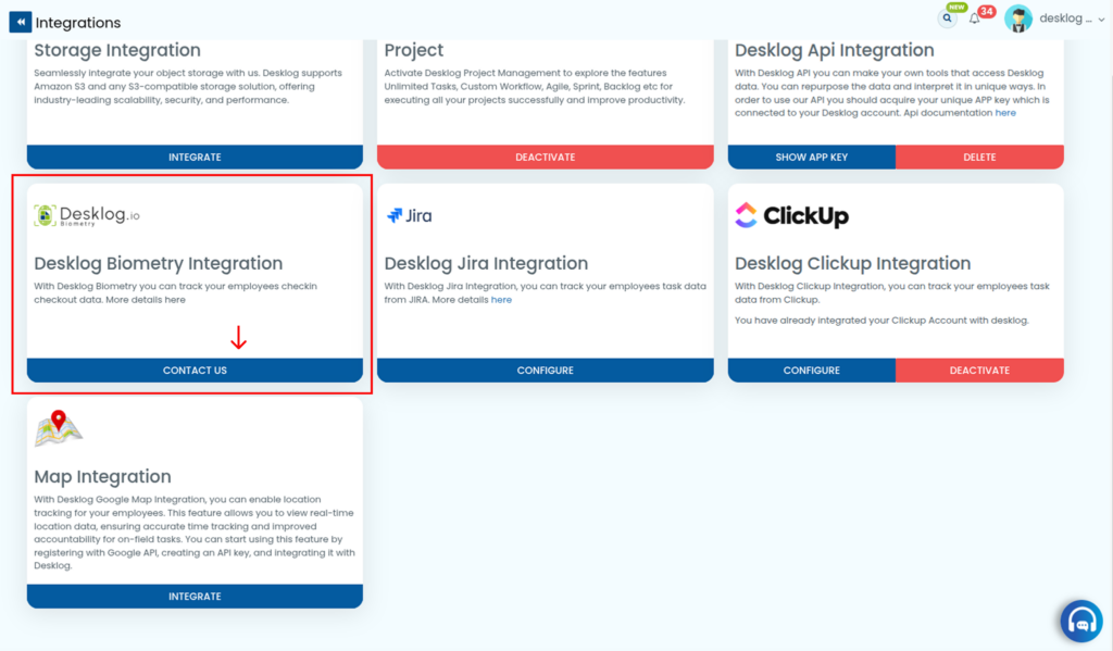 Locate Desklog Biometric Integration in the list. Click on the Contact Us button next to it to initiate the setup process.