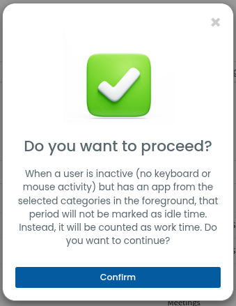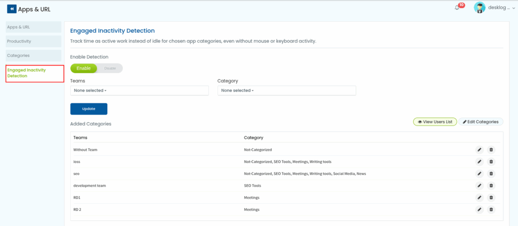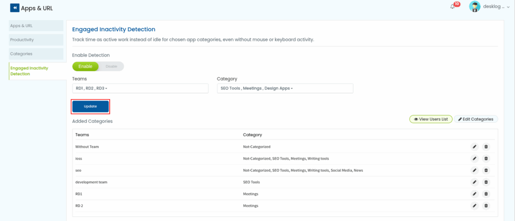 You have successfully enabled engaged inactivity detection for that team in those app categories.