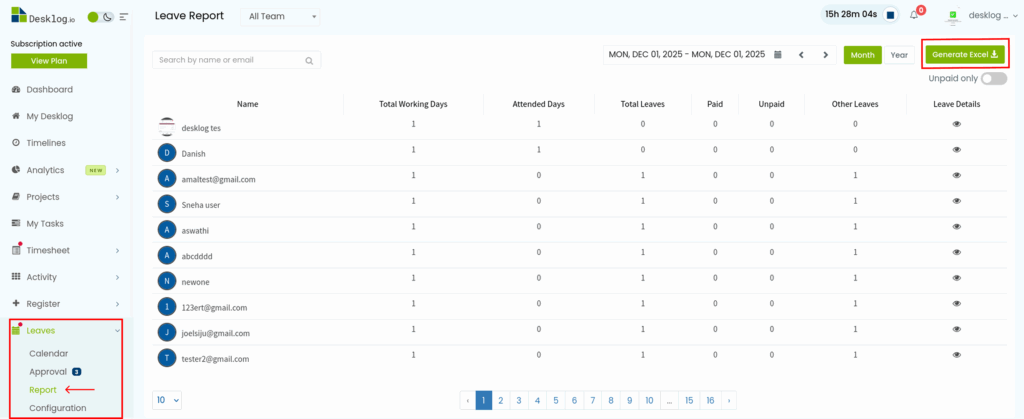 There you can access the Monthly/Yearly leave reports of all Desklog users. You can see the User names, Total Working Days, Attended Days, Total Leaves, Approved Leaves (Paid/Unpaid), Other Leaves, and Leave details of each user.
