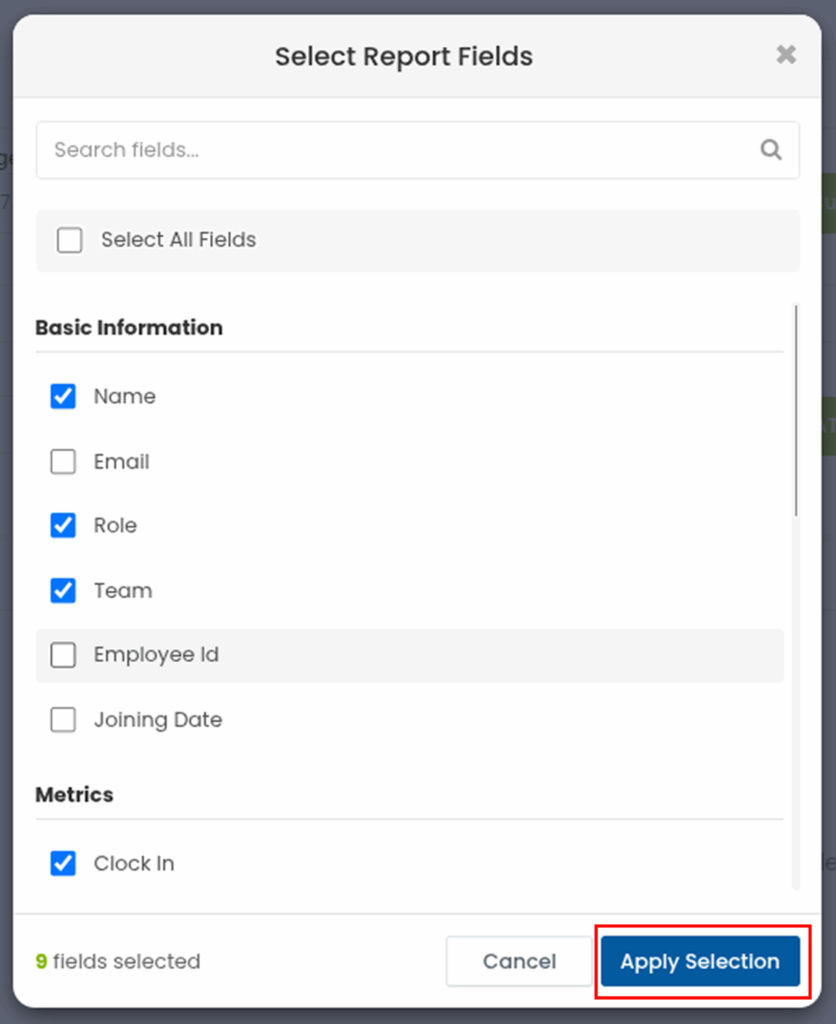 Click on Report Data Fields, then either select All Fields or choose specific fields, and click Apply Selection.