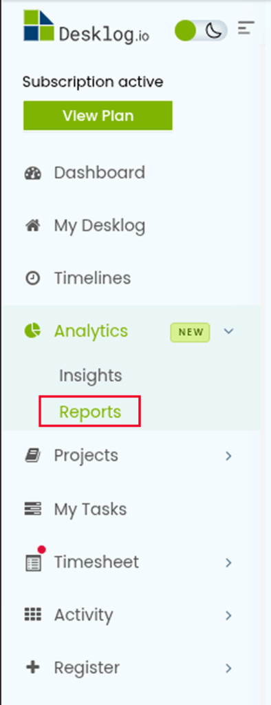 To get a timesheet report in Desklog, go to Analytics from the side menu bar and select Reports.