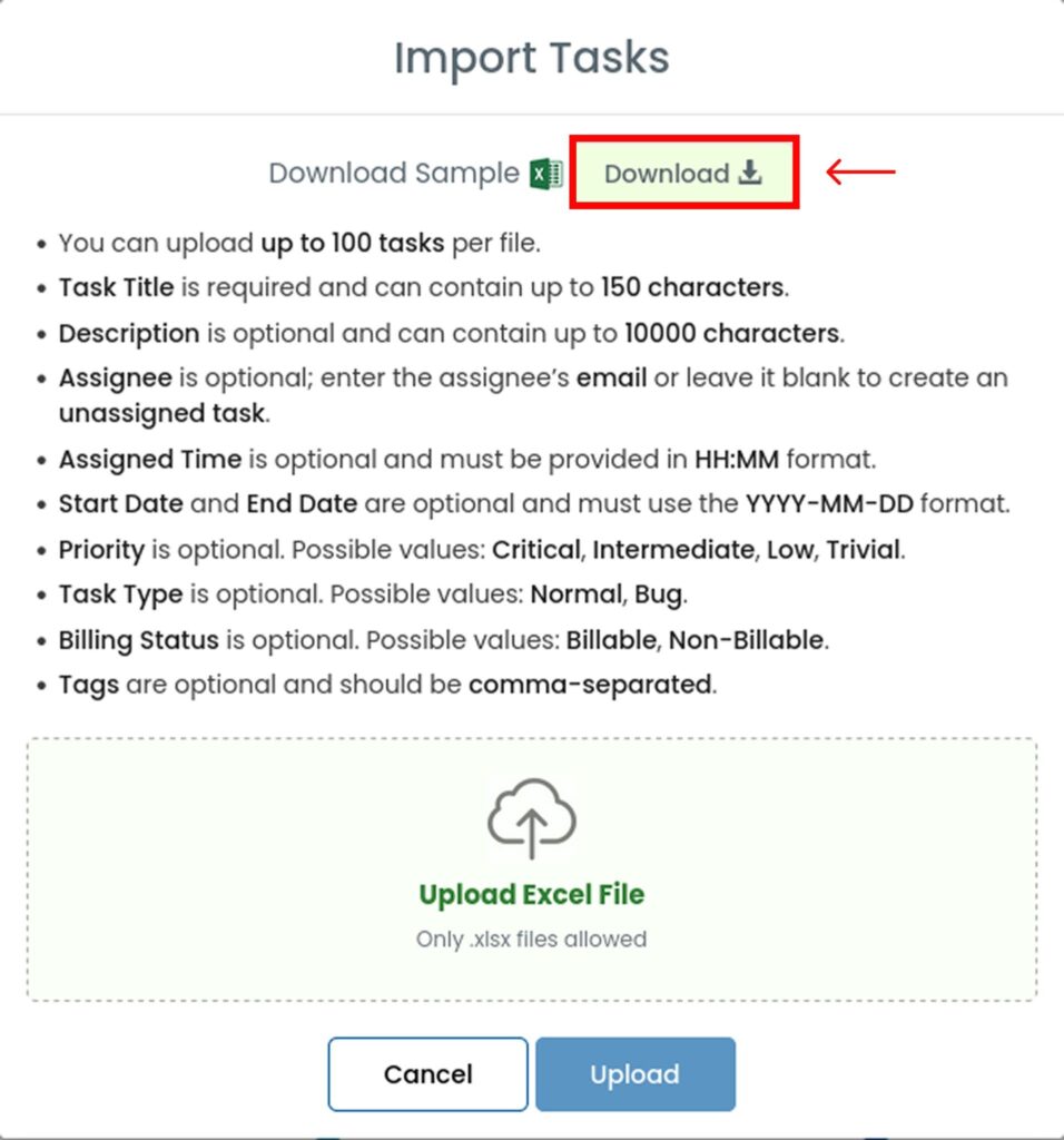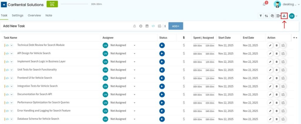 - In the project task view, go to the top-right corner and click the Import Tasks icon.