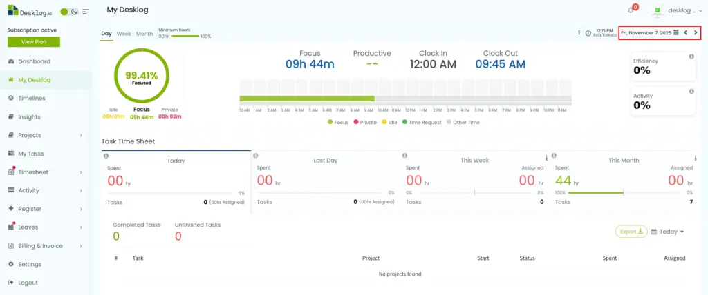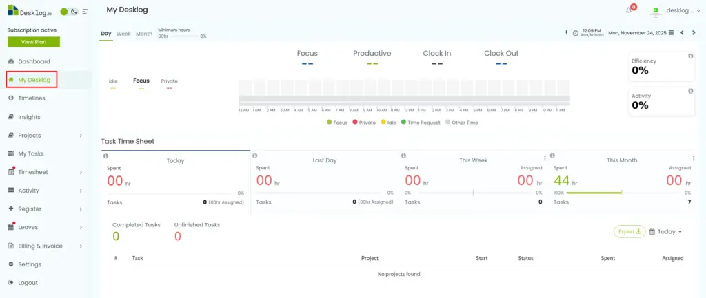 Step 1: Click on My Desklog from the left panel. This will open up a page with your timeline of work.