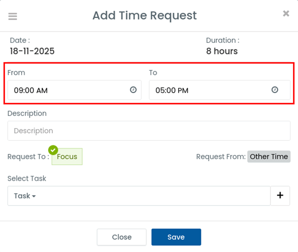 Step 4: Clicking on that area will open up a pop up. It will give you the option to set your work hours manually. You can select the time you started work in From and the time your work ended in To.