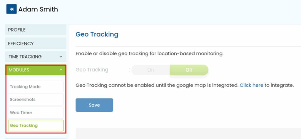 You will be redirected to the User Info page. From the left-side menu bar, select Modules and then Geo Tracking.