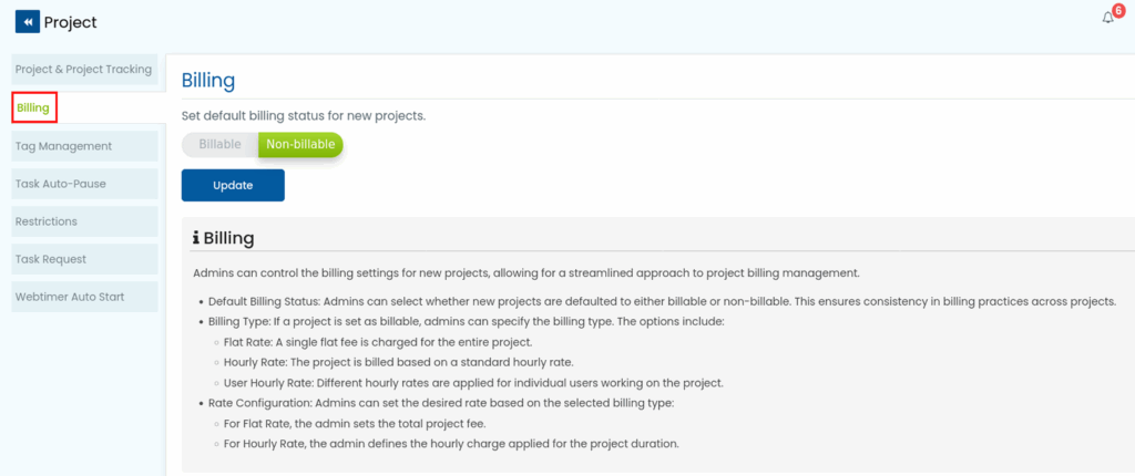 After selecting the appropriate billing type, set the Billable Rate and click Update to save your changes.