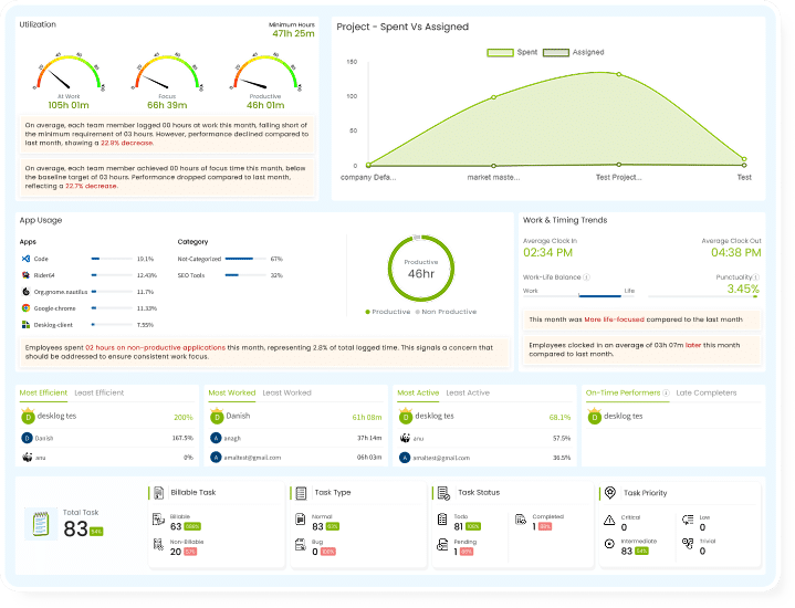 Desklog Insights delivers a real-time dashboard for monitoring employee productivity, projects, and work trends, enabling managers to make quick, data-driven decisions.